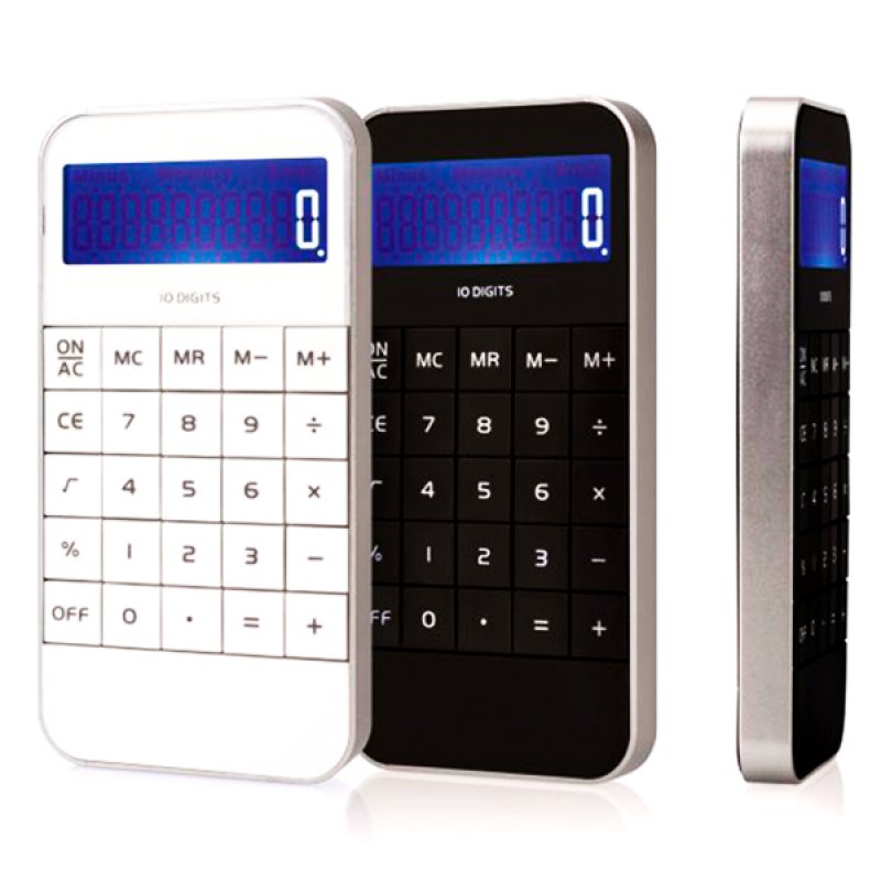 Descripción: Calculadora de bolsillo de color blanco, bordes plateados.