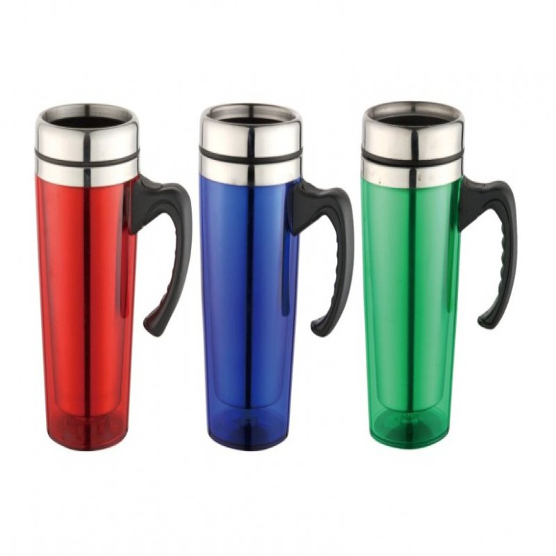 Descripcion: Jarro de interior totalmente metálico color plateado, por afuera acrílico traslíºcido de color azul, verde o rojo, borde superior y tapa de metal plateado, y asa de plástico color negro.