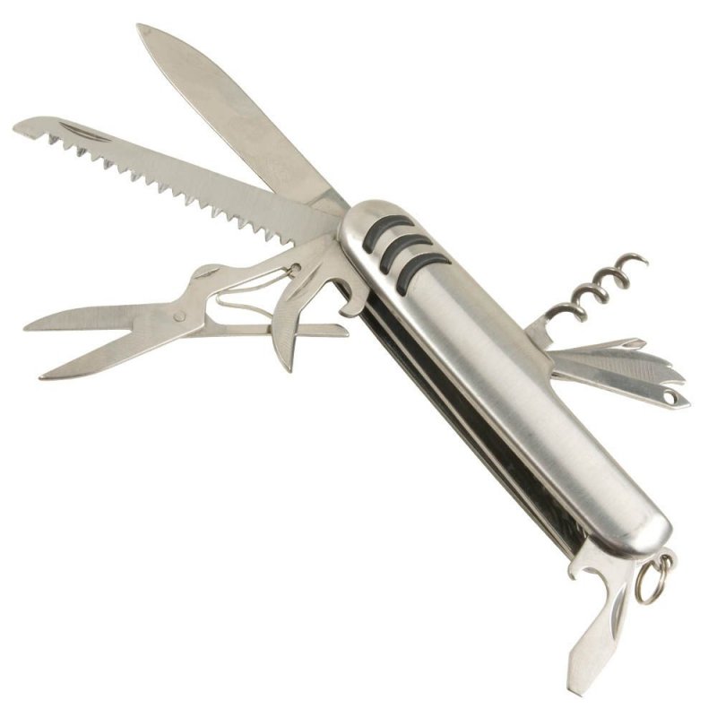 Medidas: Ancho: 2 cm. / Alto: 2 cm. / Largo: 9 cm. (Aprox.) Descripcion: Hoja de 6 cm., limpia uñas, saca corchos, 2 tipos de sierra, tijeras, abrelatas, punzon, abridor de botellas con funcion de destornillador plano, destonillador estrella, pinza quita astillas. Medidas: Ancho: 2 cm. Alto: 2 cm. Largo: 9 cm.