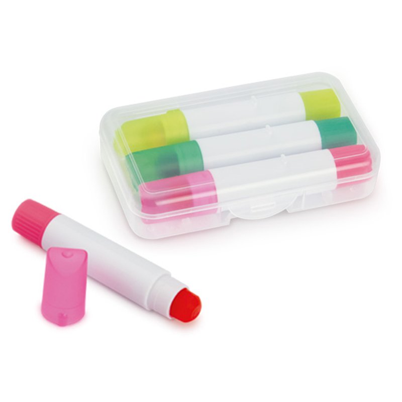 Estuche Transparente, contiene 3 Resaltadores color Amarillo, Verde y Fuxia . Medidas Aprox. Alt. 8cm Ancho. 5cm