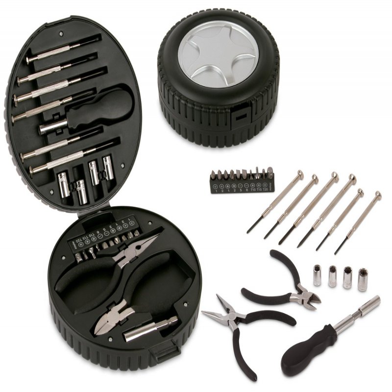 24 piezas. Cajita negra. Herramientas: Alicate, Mango de desarmador, Vástago o caña de desarmador, Puntas adaptadores para desarmador (10 und), Dados hexagonales para desarmador (5 und), Llave Allen para desarmador (3 tamaños), Dos desarmadores delgados con punta estrella y punta plana, Wincha.