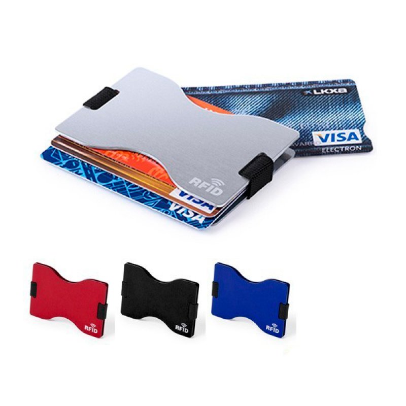 TARJETERO RFID Tarjetero con tecnología de seguridad RFID (Identificación por Radio Frecuencia) que mantiene seguros los datos de las tarjetas. Resistente cuerpo doble de acabado en aluminio brillante con sistema de fijación mediante bandas elásticas y diseñado para almacenar varias tarjetas. Presentado en bolsita individual de diseño. Aluminio Protector RFID. 1 Compartimento. Especificaciones Artículo 8,9 cm / 5,8 cm / 0,7 cm | 29 gr